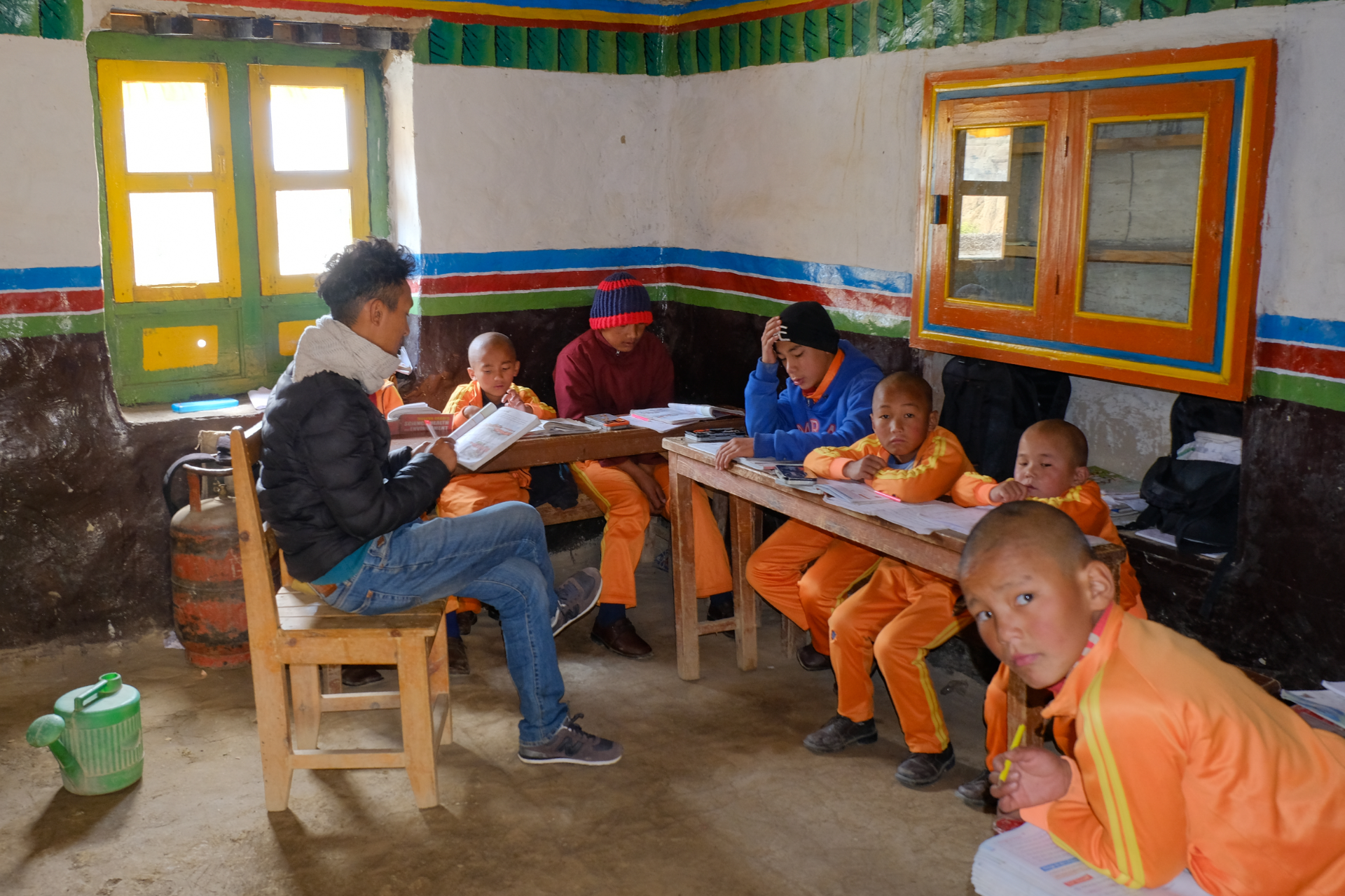 Die Bilder erzählen Geschichten vom Leben in dieser kargen Landschaft : Sie zeigen Szenen des Alltags , der Verbundenheit der Menschen zum Buddhismus , Bilder von harter Arbeit , vom Schulbetrieb .